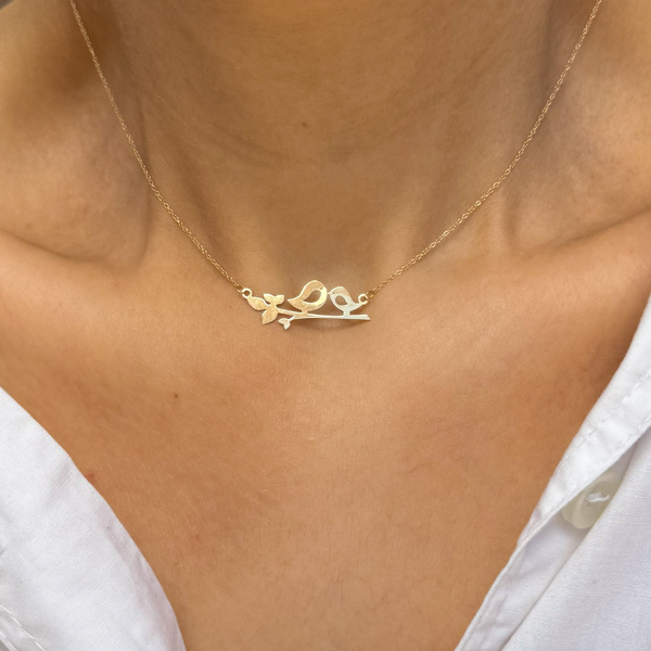 گردنبند طلا دو پرنده، نمادی از عشق، آرامش و هم‌دلی است. طراحی ظریف این گردنبند از دو پرنده‌ی نشسته روی شاخه‌ای الهام گرفته که به زیبایی، احساس صمیمیت و پیوند را به نمایش می‌گذارد.